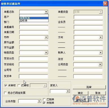 財(cái)務(wù)人員雙擊{應(yīng)收單據(jù)審核},彈出“應(yīng)收單過濾條件”窗口,選擇“客戶”、“單據(jù)編號”、“單據(jù)日期”、“合同號”等條件后,點(diǎn)擊〖確定〗,出現(xiàn){應(yīng)收單據(jù)列表}。