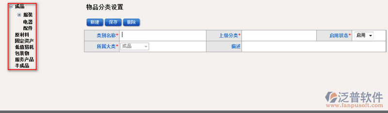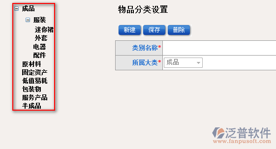 4、創(chuàng)建好的物品分類都會以列表的形式顯示在左邊樹形菜單中。如圖: