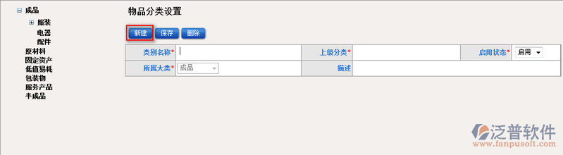 2、點(diǎn)擊上圖中的【新建】即可創(chuàng)建新的物品分類。如圖: