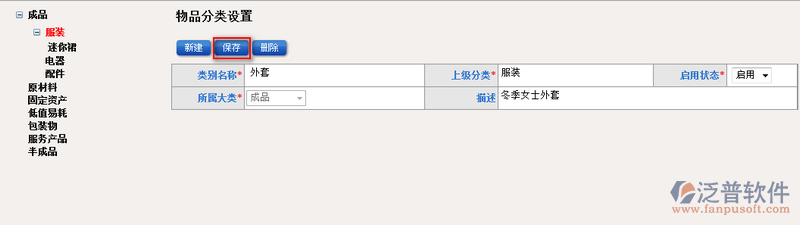 3、填寫完相關(guān)信息,點(diǎn)擊【保存】即可完成物品分類的新增。如圖: