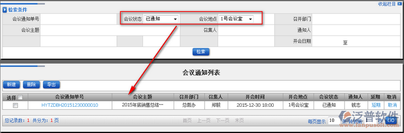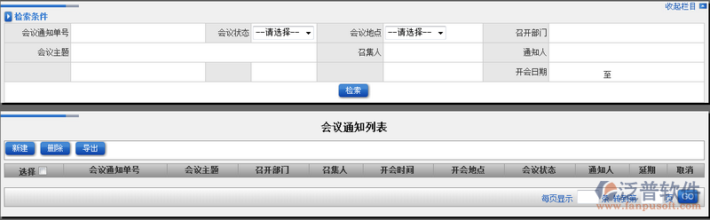 2、打開主界面可以通過此頁面的【檢索條件】,進(jìn)行對(duì)應(yīng)的會(huì)議通知查詢。在會(huì)議通知多的情況下,運(yùn)用檢索條件功能即可快速查找對(duì)應(yīng)的通知。如圖: