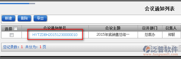 3、點(diǎn)擊【會(huì)議通知單號(hào)】即可查看本會(huì)議通知單的詳細(xì)信息