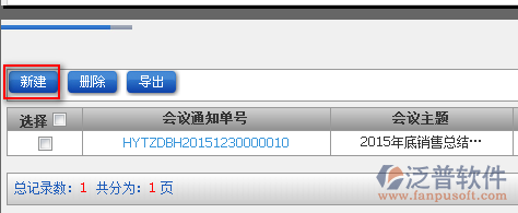 4、點(diǎn)擊左上角的【新建】即可進(jìn)入會(huì)議通知單的新增頁面。如圖: