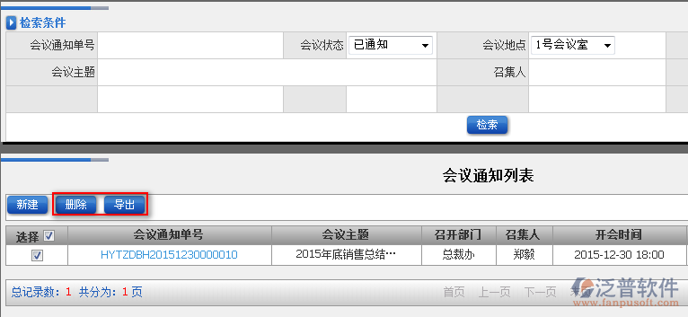 5、過期的會(huì)議通知可以點(diǎn)擊【刪除】。在有必要的情況下,用戶可以點(diǎn)擊【導(dǎo)出】進(jìn)行相關(guān)會(huì)議通知單的導(dǎo)出功能。如圖: