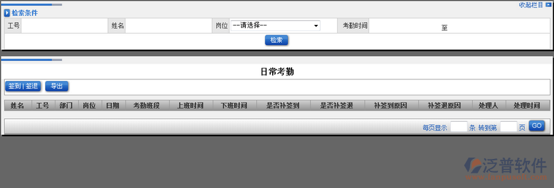ERP系統(tǒng)中日??记谥饕菍T工每天考勤的一個統(tǒng)計。員工需要每天登陸系統(tǒng)在【日常考勤】中進行考勤的簽到、簽退,操作完這些步驟才能算考勤成功。日??记谥饕獌热菔牵汉灥健⒑炌?,同時可以通過:工號、姓名、崗位、考勤時間等相關信息進行模糊檢索