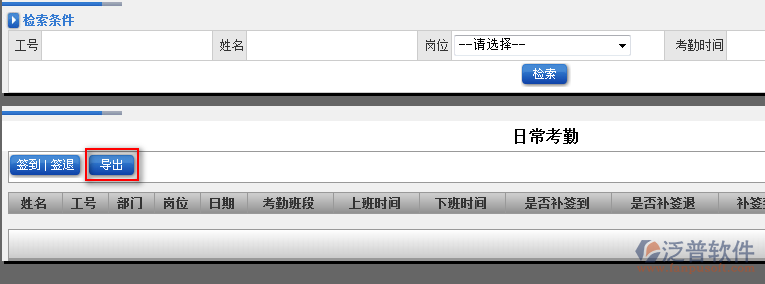 2、行政部員工在對本月所有員工考勤進行統(tǒng)計時,可以通過系統(tǒng)的【導出】功能,進行日??记诘南螺d。點擊【導出】即可:如圖