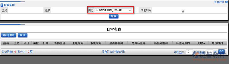 3、查詢單個員工考勤時,可以運用系統(tǒng)提供的檢索條件進行模糊查詢,選擇對應的工號、姓名、崗位等相關信息進行查詢。系統(tǒng)提供單個條件或者多個條件進行查詢。如圖:
