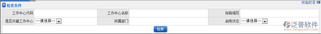 3.可以按照工作中心代碼、工作中心名稱、拼音縮寫、是否關鍵工作中心、所屬部門、啟用狀態(tài)查詢工作中心
