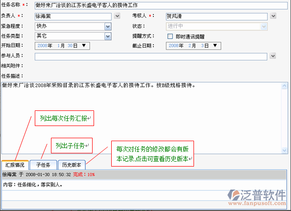 l 狀態(tài)為“未開始”的任務(wù)沒有任務(wù)匯報(bào)按鈕,即不能進(jìn)行匯報(bào)。應(yīng)用場(chǎng)景:賀總(任務(wù)創(chuàng)建人)提前一個(gè)月布置了三位部門經(jīng)理關(guān)于參加廣交會(huì)的各項(xiàng)準(zhǔn)備的任務(wù),那么這三位經(jīng)理就收到了任務(wù),這樣就有心理準(zhǔn)備以便安排其他工作;不過,賀總要求只能提前半個(gè)月才開始這些準(zhǔn)備工作。這樣,賀總可以在倒計(jì)時(shí)半個(gè)月的時(shí)候再把任務(wù)狀態(tài)修改為“進(jìn)行中”,這時(shí)三位經(jīng)理就可以看見任務(wù)匯報(bào)按鈕來填寫進(jìn)度匯報(bào)了。