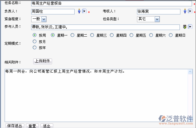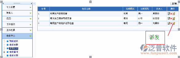 這里需要特別說明的是:和日程安排不同,“定期事件”設(shè)置好之后,會(huì)自動(dòng)定期提醒。而定期任務(wù)是需要每次派發(fā)的,即只是為了減少每次新增同樣任務(wù)的麻煩。派發(fā)一次,相關(guān)人員就收到這個(gè)新任務(wù);第二次派發(fā),相關(guān)人員就再次收到新任務(wù);如果不派發(fā),相關(guān)人員就不能收到這個(gè)任務(wù)。