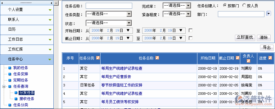 有權(quán)限的用戶可以進(jìn)行任務(wù)查詢。任務(wù)查詢按分發(fā)任務(wù)和接收任務(wù)分類。
