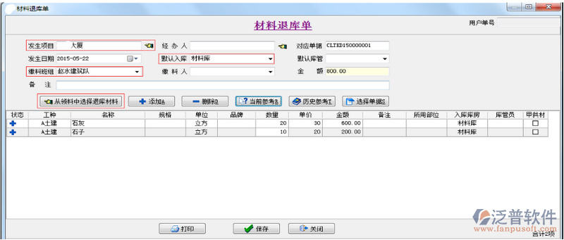 【材料退庫(kù)單】工程施工過(guò)程中,工地工人需要將竣工后剩余的材料送回倉(cāng)庫(kù),【材料退庫(kù)單】記錄了材料的送回過(guò)程。 它是發(fā)生在本企業(yè)內(nèi)部的物資流動(dòng),與外界沒(méi)有關(guān)系,所以不會(huì)影響與供應(yīng)商之間的賬款關(guān)系。錄入本單據(jù)前,需先錄入要用到【材料維護(hù)】、【項(xiàng)目維護(hù)】(包括【庫(kù)房信息】、【領(lǐng)料班組信息】)。