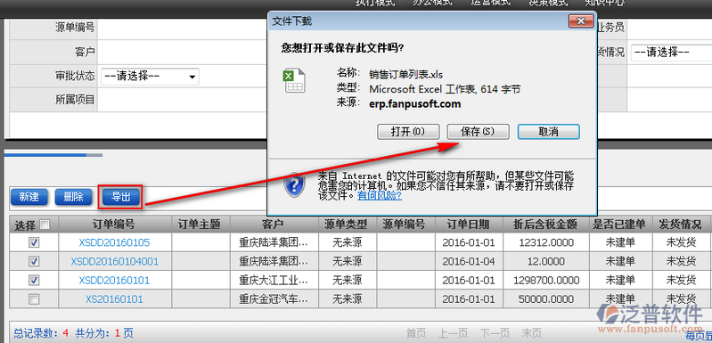 4、選中需要導(dǎo)出的銷(xiāo)售訂單信息,點(diǎn)擊【導(dǎo)出】即可實(shí)現(xiàn)銷(xiāo)售訂單信息的導(dǎo)出功能。如圖: