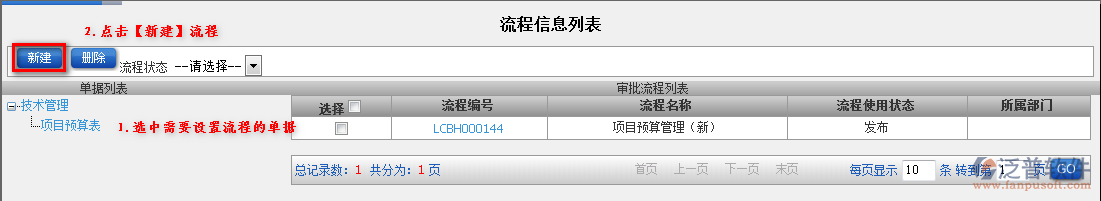 2.點擊左側(cè)單據(jù)名稱選擇需要設置的流程后,再點擊【新建】