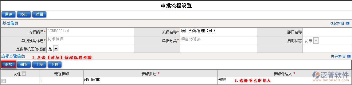 3.填寫流程名稱,使用部門范圍,是否短信提醒等,最后進入流程步驟設置。點擊【添加】