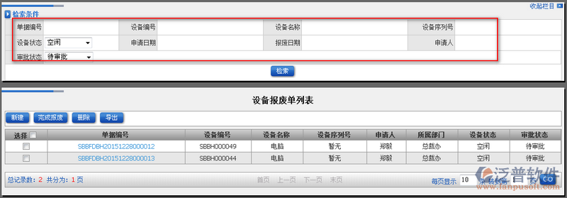 1、點(diǎn)擊【設(shè)備報(bào)廢單列表】進(jìn)入模糊查詢頁(yè)面。上半部分主要為檢索條件,下半部分為設(shè)備報(bào)廢單顯示。其中檢索條件可以按照多個(gè)條件或者單個(gè)條件進(jìn)行查詢