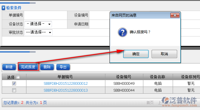 2、審批完成后的工作流程才能進(jìn)行真正的設(shè)備報(bào)廢操作,選中需要報(bào)廢的申請(qǐng)單,點(diǎn)擊【完成報(bào)廢】即可完成