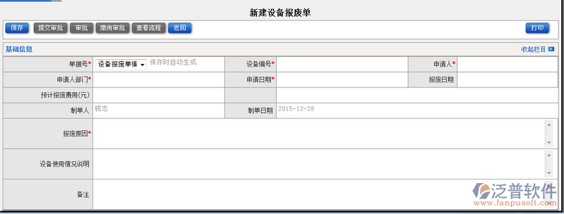 3、設(shè)備報(bào)廢單列表中可以直接新增設(shè)備報(bào)廢單,點(diǎn)擊【新建】即可進(jìn)去設(shè)備報(bào)廢單的新增頁(yè)面。此處關(guān)聯(lián)【新建設(shè)備報(bào)廢單】功能如圖: