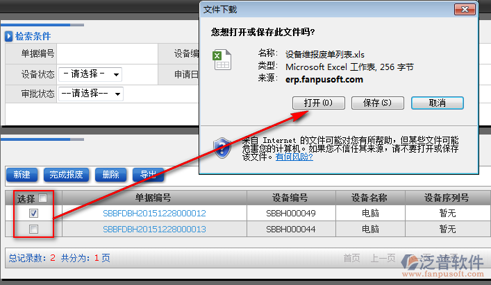 4、在設(shè)備報(bào)廢單列表中用戶可以根據(jù)需要進(jìn)行相關(guān)信息的導(dǎo)出功能,選中需要導(dǎo)出的報(bào)廢信息點(diǎn)擊【導(dǎo)出】即可。如圖: