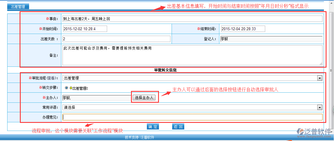 點(diǎn)擊出差管理頁(yè)面中【增加】進(jìn)入新增頁(yè)面,填寫(xiě)里面對(duì)應(yīng)的相關(guān)內(nèi)容,點(diǎn)擊“確定”進(jìn)行一個(gè)保存