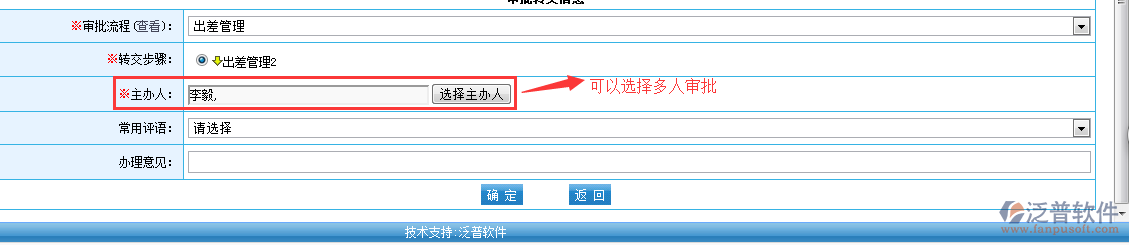 當(dāng)表單填寫(xiě)完成以后,用戶直接將表單轉(zhuǎn)交給下一個(gè)審批(或辦理)的人員,如果多個(gè)人員同事辦理,只需添加多個(gè)【經(jīng)辦人員】即可