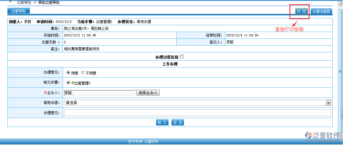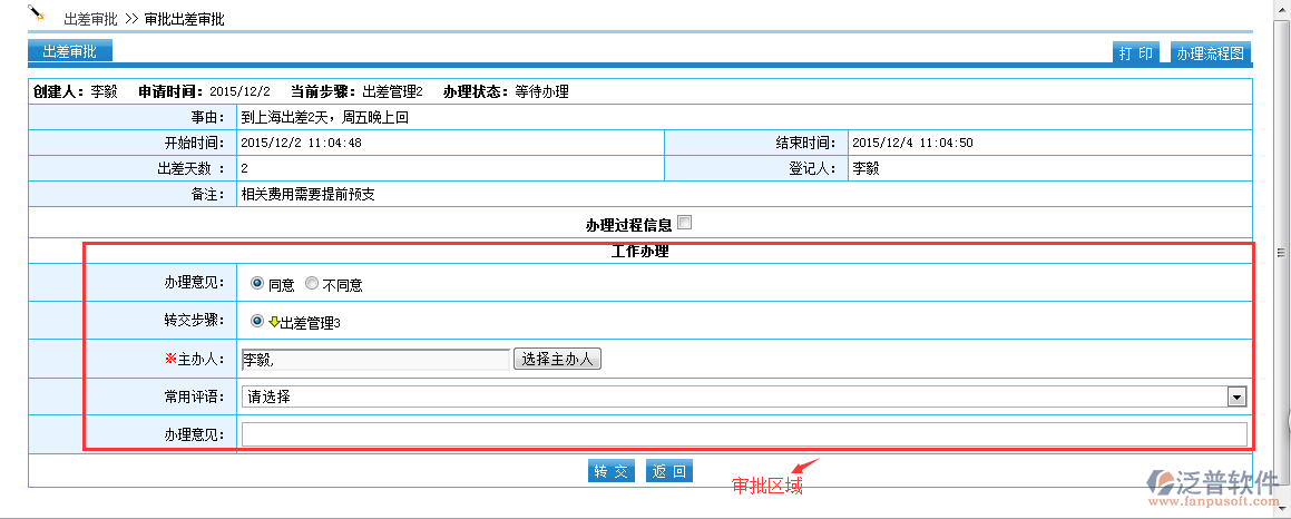進(jìn)入審批頁(yè)面可以詳細(xì)看到整個(gè)表單的填寫(xiě)情況,以及辦理過(guò)程信息,填寫(xiě)對(duì)應(yīng)的辦理意見(jiàn)可以直接提交