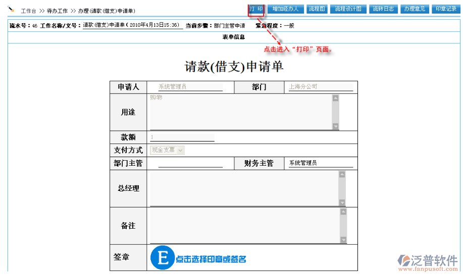 在辦公的時候,如果想將表單明細以及辦理的過程,日志等內(nèi)容打印保存,我們可以在表單辦理頁面的右上角點擊【