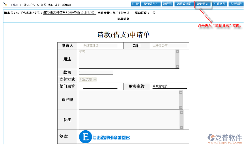 如果想查看此表單的什么時候建立的,誰做過說明樣的操作,都可以通過【流轉(zhuǎn)日志】,我們可以在表單辦理頁面的右上角點擊【