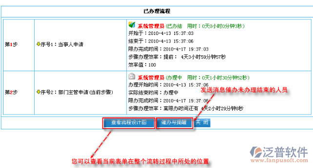 點擊【流程圖】進入到查看頁面,在查看頁面,您能看見此表單都有誰辦理過,誰正在辦理,誰還未接收辦理,辦理工作耗費了多長時間。以及點擊【查看流程設(shè)計圖】您可以查看當前表單在整個流轉(zhuǎn)過程中所處的位置,如圖: