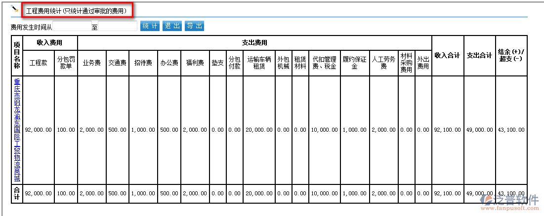 工程費(fèi)用統(tǒng)計(jì):(此報(bào)表以收支兩條線來統(tǒng)計(jì)工程成本,收入來源于工程款回收,支出根據(jù)支出類型分類來的,在報(bào)銷或者申請的時(shí)候選擇對應(yīng)分類統(tǒng)計(jì)支出費(fèi)用)
