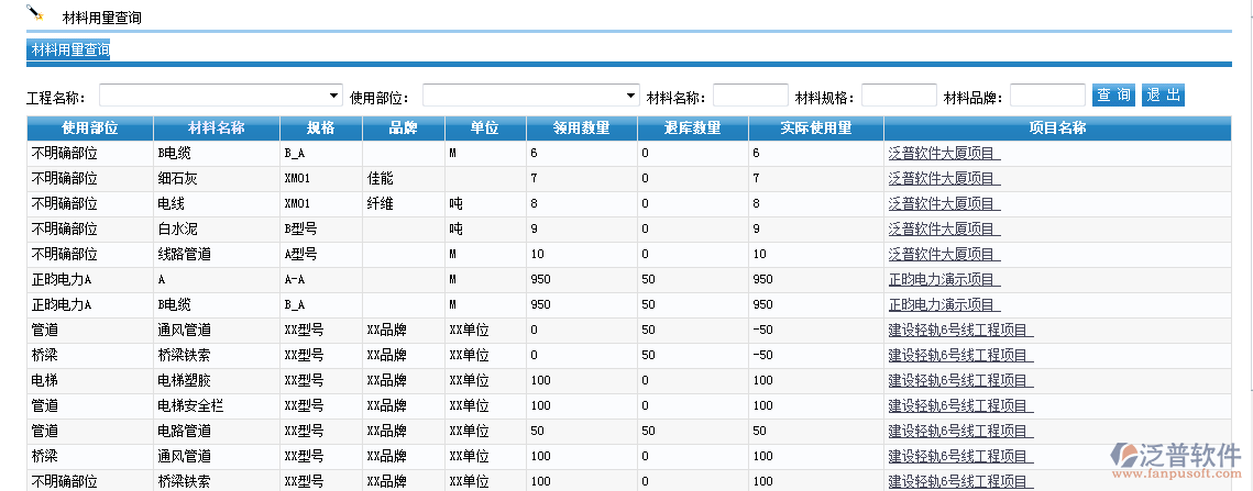 材料用量查詢,可以選擇項(xiàng)目還有分部分項(xiàng),查詢具體分部分項(xiàng)領(lǐng)用量、退庫量、實(shí)際用量
