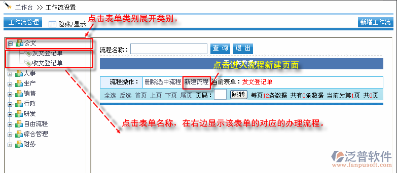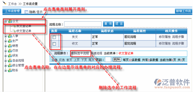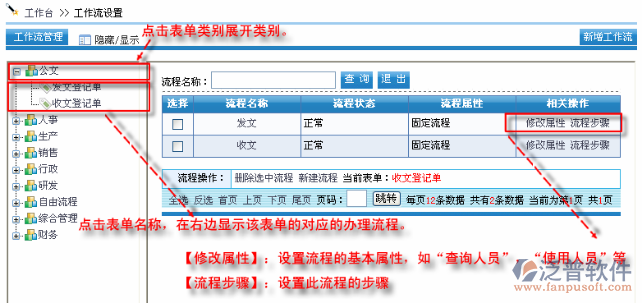 首先進入到【系統(tǒng)設置】-【工作流管理】-【工作流設置】頁面,點擊【流程名稱】列表中需要設置的流程名稱。如圖: