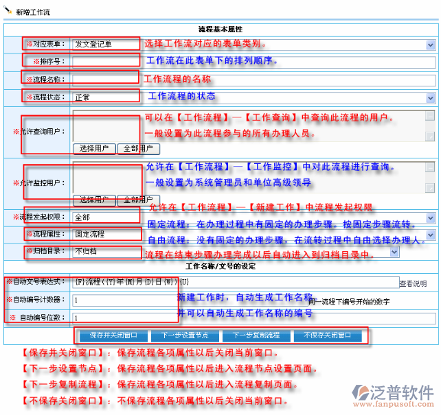 第一步,點擊【新建流程】進入到流程屬性頁面,填寫完流程各項屬性以后,可以進入流程步驟設置或復制以前的流程步驟,如圖: