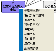 設置好步驟以后,我們還需要進行步驟中的“可寫字段”設置、“追加下一步驟”等操作。首先我們用鼠標左鍵點擊一下要設置的步驟,點擊以后步驟顏色變?yōu)樽仙?,然后再鼠標上面點擊右鍵出現(xiàn)各項右鍵菜單。如圖: