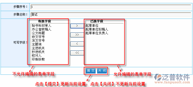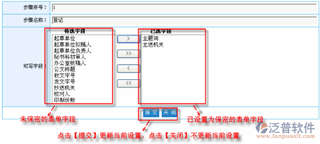 【可寫字段】:設置表單在當前步驟的可寫字段。字段是在表單設計中添加的各項控件。步驟的可寫字段表示在當前步驟辦理的時候,操作人員可編輯哪些輸入框。