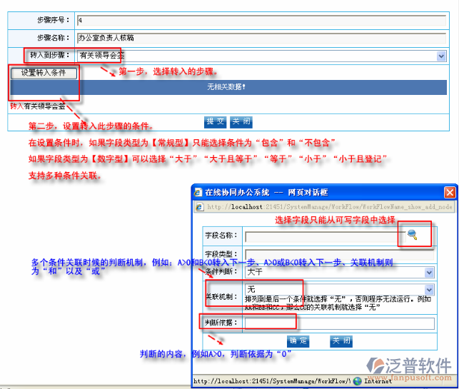 【條件設置】:設置當前步驟轉交到下一步驟的條件判斷,例如申請金額大于100轉交到步驟A,金額小于100轉交到步驟B,則可以在此處設置。