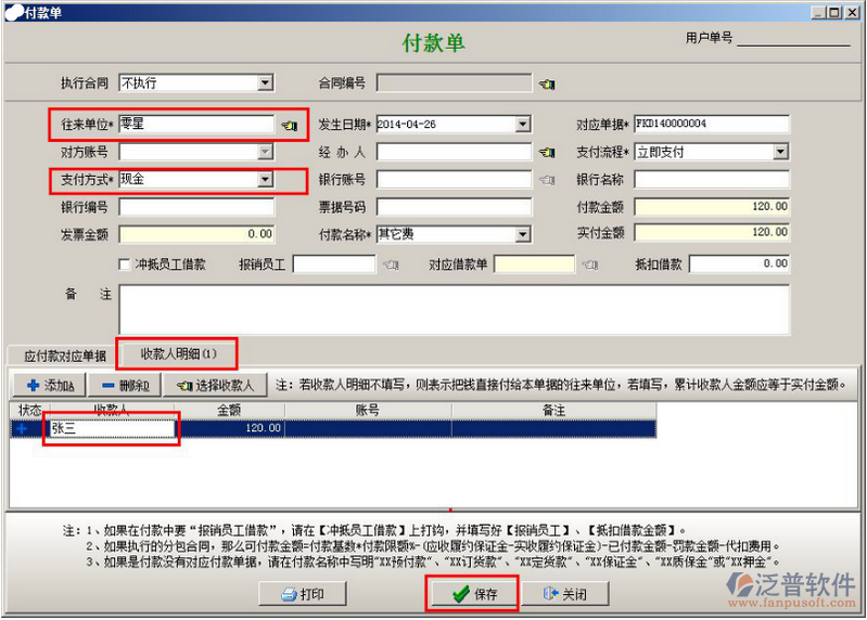 (5)因?yàn)殄X是直接給的員工,所以在做【付款申請單】或【付款單】時(shí),注意“收款人明細(xì)”中寫名收款為墊付的員工。往來單位要寫明真實(shí)單位,如果是不具名的單位,可以提前在基礎(chǔ)信息的【往來單位維護(hù)】中添加一個(gè)名稱為“零星”的單位,統(tǒng)一處理類似費(fèi)用的支出。如下圖: