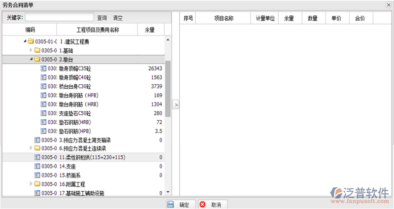 注意:1、此處不同于勞務(wù)合同評(píng)審,“勞務(wù)合同清單”對(duì)話框中,余量為0的末級(jí)清單也能被添加到右側(cè),因?yàn)槿绻骱贤邪褦?shù)量用完,補(bǔ)充合同需要對(duì)單價(jià)進(jìn)行修改;