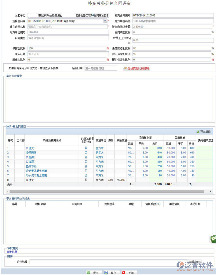 (三) 甲方材料供應(yīng)清單:填寫方式同【勞務(wù)合同評(píng)審】里的【甲方材料供應(yīng)清單】。