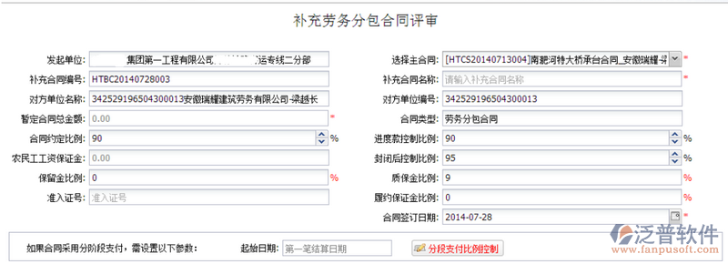 5. 對(duì)方單位名稱、對(duì)方單位編號(hào)、合同類型、合同約定比例、進(jìn)度款控制比例、封閉后控制比例、保留金比例、質(zhì)保金比例、農(nóng)民工保證金、履約保證金選擇主合同后自動(dòng)獲取;