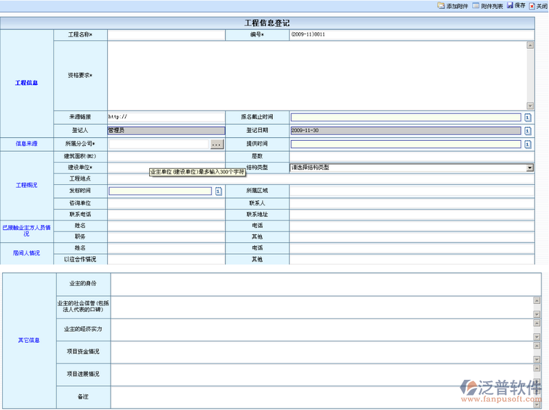 在項目立項登記中要調(diào)用該建設(shè)單位。點擊右上角的“新建”按鈕,進入登記界面,如下圖所示:必填項字段后面有一個“*”號來表示,其他字段可選擇性填寫,填完后點擊右上角“保存”按鈕即可。