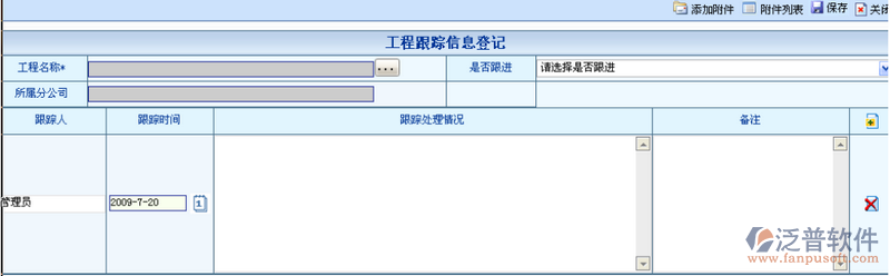 工程信息跟蹤模塊記錄跟進工程的情況信息。只有在前面做過工程信息登記了工程后才可在本模塊來調(diào)用該工程,對該工程進行跟蹤信息的登記。登記界面如下:選中某工程名稱,則表示針對該工程進行跟蹤處理情況登記。