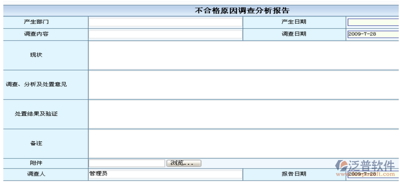 不合格原因調(diào)查分析:記錄不合格原因分析及處理結(jié)果等信息。方便后期再追查責(zé)任時(shí)能快速查詢到。登記界面如下圖所示: