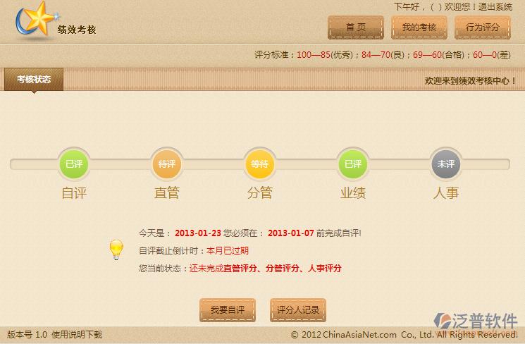 泛普績效管理系統(tǒng):一個從員工自評,直接管理者與分管領(lǐng)導(dǎo)評分,部門業(yè)績,到人事評分的過程來保證績效考核的公平性及有效性的系統(tǒng)。滿足以指標(biāo)管理為核心的績效管理系統(tǒng)建設(shè)要求,通過對指標(biāo)、權(quán)重以及評分體系的系統(tǒng)管理,來實現(xiàn)KPI績效評估、績效考核。